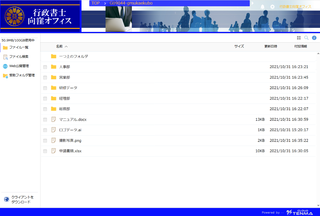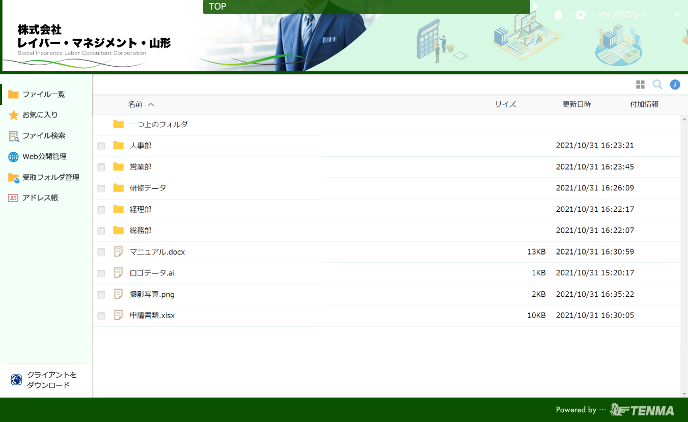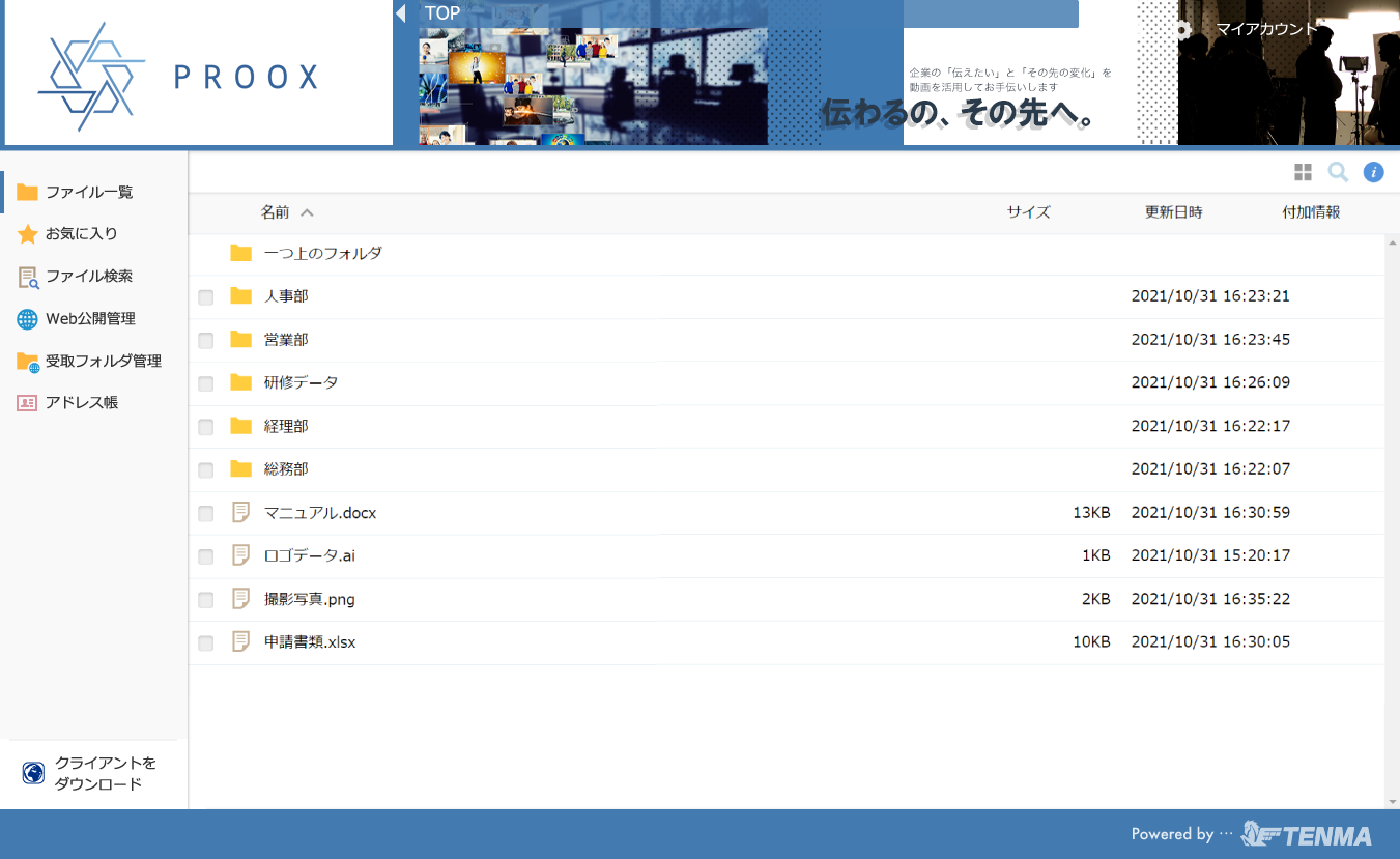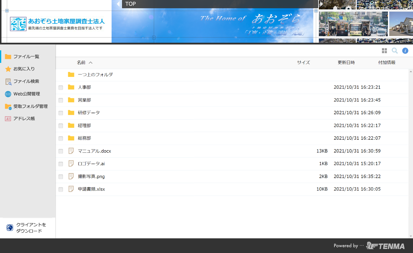 特に、法人様ですと「データを外でも見れる事は便利だが、セキュリティが心配」という声が多いのですが、オンラインストレージクラウドTENMAは、セキュリティも強固なうえに、ファイル共有にも最適とお客様から非常に支持されております。