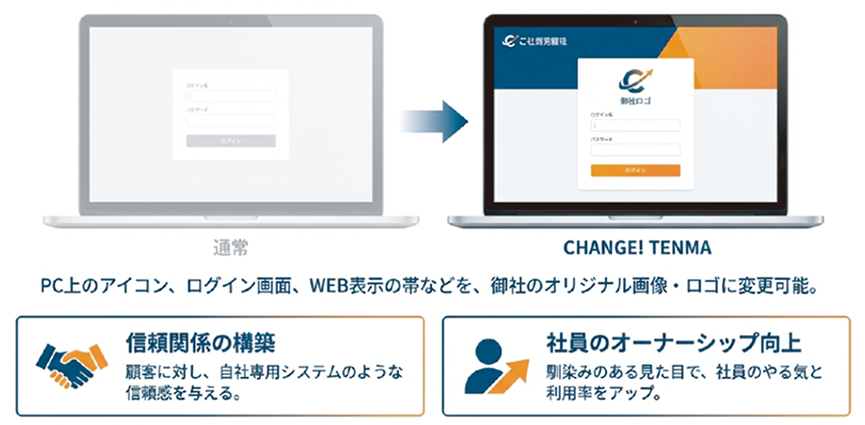 CHANGE!TENMAは、PC上のアイコン・ログイン画面の画像・WEB表示の帯をオリジナルの画像に変更可能。