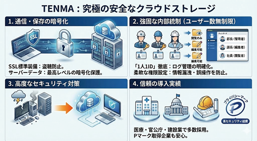 多くの企業様が抱えるその不安、TENMAなら解決できます。 通信の暗号化やアクセス制限といった