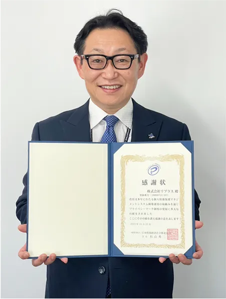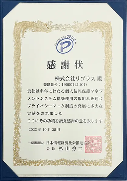 長年にわたり、個人情報保護に尽力し、プライバシーマーク制度に深い理解をしていることが認められこの度、感謝状を授与いただきました