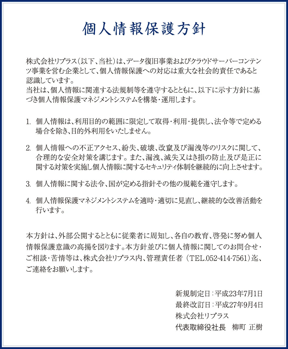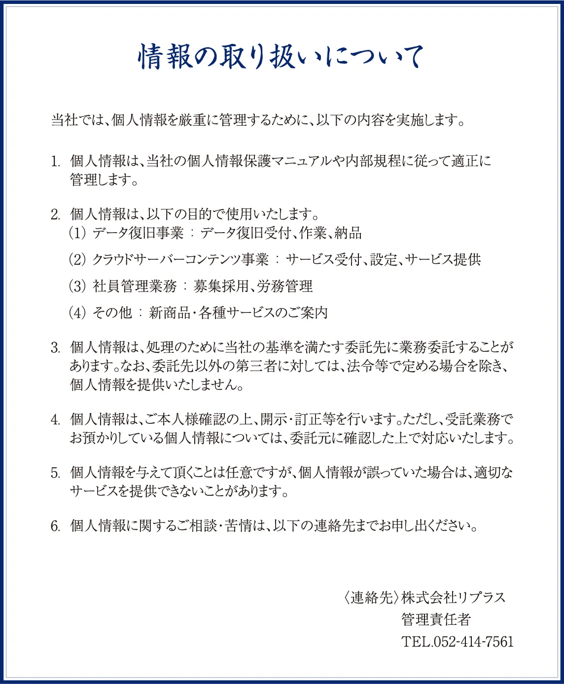 データ復旧事業およびクラウドサーバーコンテンツ事業を営む企業として、個人情報保護への対応は重大な社会的責任であると認識しています